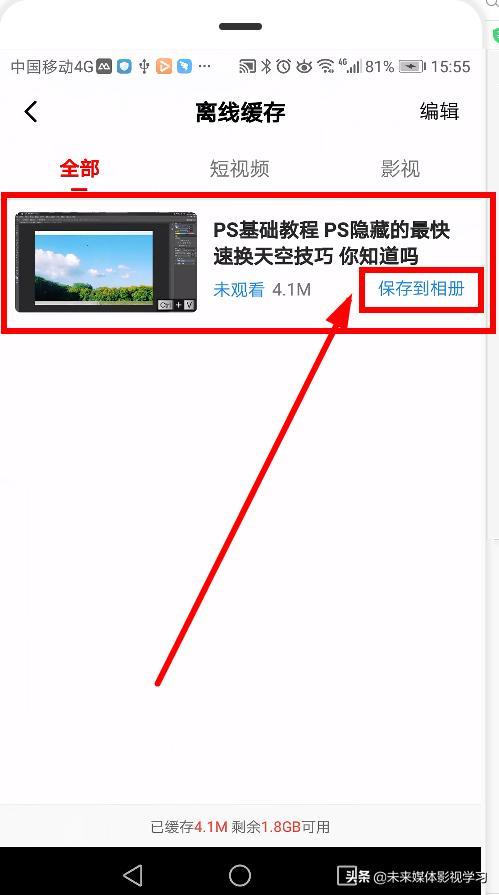 第五步:点击离线缓存,进入如下图所示页面,根据视频的大小,然后将视频保存到相册