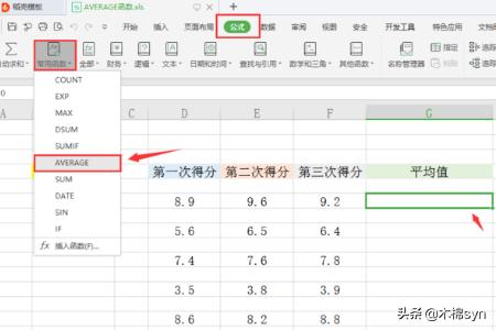 2、在菜单栏里选择公式,打开常用函数下拉框,点击里面的AVERAGE函数。