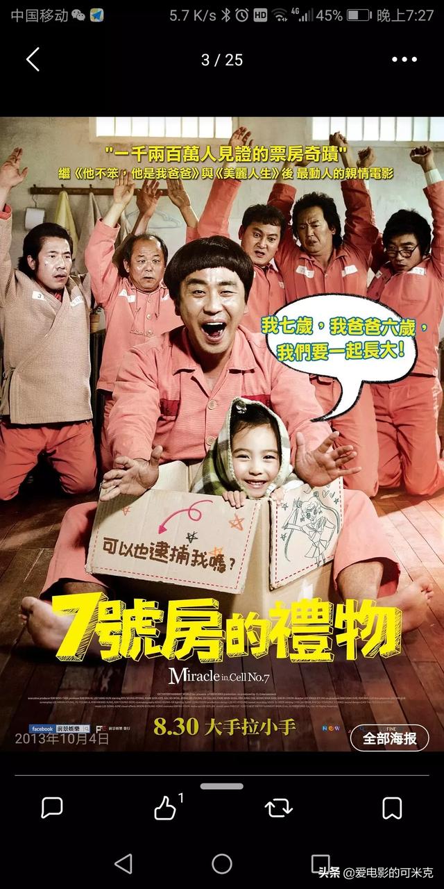 推荐1.《七号房的礼物》2013年的高分佳作,柳承龙、朴信惠主演,讲述智障父亲于女儿的感人催泪韩国电影。