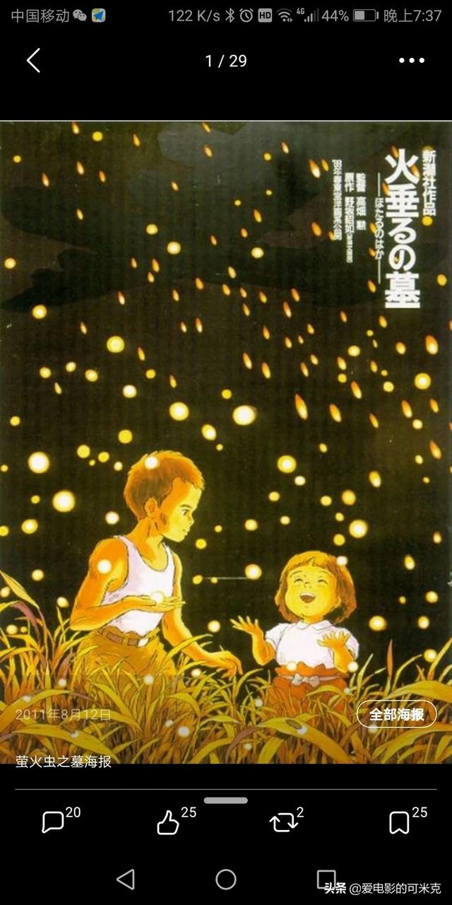 推荐4.《萤火虫之墓》1988年由高畑勋导演制作的反战题材动画,一部看一次都不敢看第二次的电影。当时第一次看过之后一个星期都没有从影片的氛围中走出来,每次想到剧中桥段都会落泪。