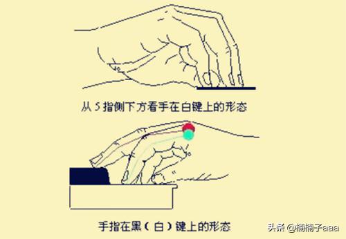 4、整只手(从整个前臂到手)应该像水平位置摆在黑白琴键上、应使手指摆正,与琴键排列平行、大指应同样水平放在琴键上面。